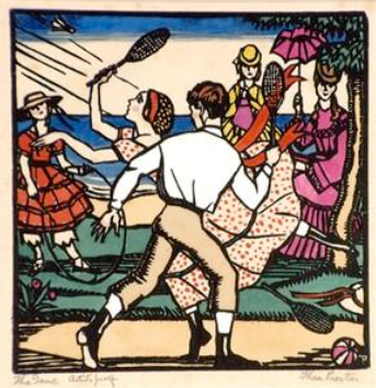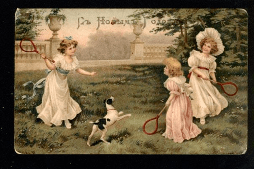 Escena: En el exterior de niños jugando al bádminton de niños, observados por una muchacha con un aro y dos mujeres, una con un parasol.