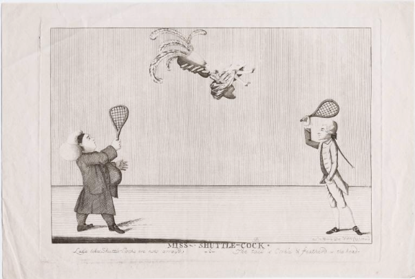 Un hombre con el traje tradicional administrativo y su opositor, probablemente "Richard Sneer "usan a una señora como su shuttlecock (volante). Levantado alto en el aire por las plumas de avestruz en su pelo, el corcho ligero ayuda al vuelo de la señora.