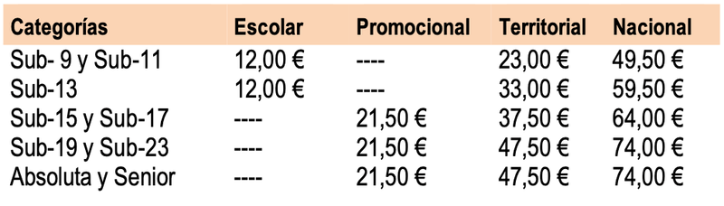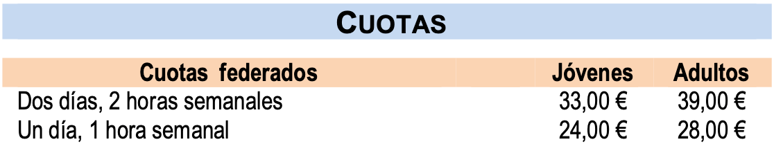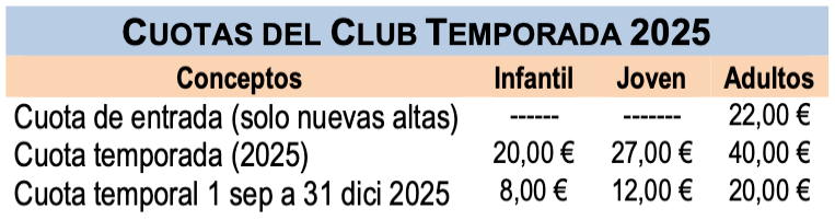 Las cuotas se abonarán al club, quien procederá a realizar los abonos correspondientes por las cuotas municipales, las licencias federadas y la inscripción en competiciones. La cuota de alta, la tarjeta municipal y licencia federada se realizarán en el pago inicial de la inscripción. Las cuotas mensuales se podrán abonar cada mes o trimestralmente.