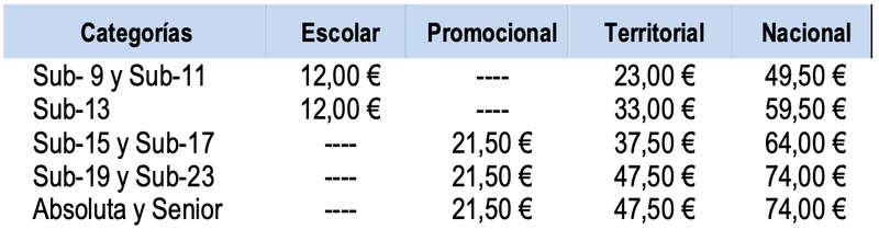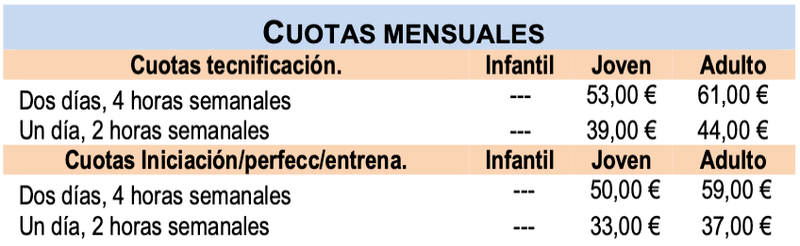 Las cuotas se abonarán al club, quien procederá a realizar los abonos correspondientes por las cuotas municipales, las licencias federadas y la inscripción en competiciones. La cuota de alta, la tarjeta municipal y licencia federada se realizarán en el pago inicial de la inscripción. Las cuotas mensuales se podrán abonar cada mes o trimestralmente.