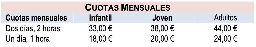 Las cuotas que hay que abonar a la federación por licencia federada se realizarán en el pago inicial de la inscripción. Las cuotas por escuelas y entrenamientos podrán abonarse cada mes o trimestralmente. En función de las fechas que en que solicite la baja, se deberán abonar la mensualidad: si solicita baja entre 1-15 del mes se cobra medio mes; si es del 16-30 se cobra el mes entero.