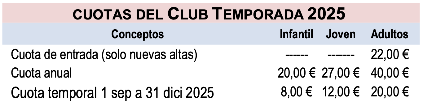 Las cuotas se abonarán al club, quien procederá a realizar los abonos correspondientes por las cuotas federadas (licencias o inscripción en competiciones).