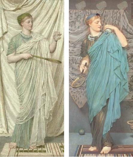 “El cuadro de la izquierda es una versión pequeña (15,30 x 37,00cms.) de 'Battledore' grande (106.5 x 44.5 cms.) expuesta en la Academia Real en 1871. Es común encontrar versiones diferentesen los trabajos de Moore. Estos bosquejos en color a menudo serían terminados después de que la versión grande era completa y esto representaría (explicaría) la fecha de Baldry de 1872 para este trabajo que tiene una combinación de colores más pálida y más delicada que el lienzo grande. 'Battledore' es una ilustración viva del anacronismo al combinar una figura clásica con los instrumentos de un juego moderno de moda.