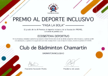 PROMIS concede los III Premios al Deporte Inclusivo 2021 en reconocimiento al esfuerzo de entidades deportivas y sociales, instituciones y profesionales por la inclusión en el deporte en la modalidad de Ecosistema Deportivo se concede al Club de Bádminton Chamartín. En representación del Club de Bádminton Chamartín, recibe el premio D. Juan Sierra. Entrega: José Marín-Roig, director de la Cátedra de Innovación de la Universidad Politécnica de Valencia - Campus de Gandía.