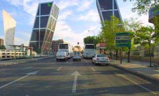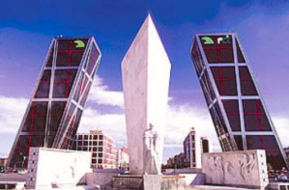 La estación ferroviaria de Chamartín, con sus características bóvedas, están representadas en las letras C y B. La letra H y, al mismo tiempo, A y M, están formadas por las dos torres inclinadas situadas en la Plaza de Castilla